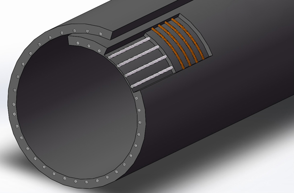 钢丝绳芯管状输送带是以钢丝绳作为芯体骨架,以高弹性、高耐磨、高强力橡胶为工作面组成的新型运输产品,主要用于输送粉状、颗粒状等易污染环境的物料。工作时胶带由平面渐变成U型,最 后成为管状,将物料包住,实现封闭输送。