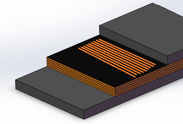 该输送带在聚酯或尼龙帆布上面(或上下)设置了横向均匀排列的高延伸钢丝绳或高强力高延伸化纤线绳作为抗撕裂层,抗撕裂层垂直于输送带运行方向。当输送带输送硬质尖锐物料时,抗撕裂层可阻挡尖锐硬物刺穿,一旦刺穿后还可产生足够抵抗尖锐硬物撕裂胶带的阻力,从而有效防止输送带撕裂现象发生。